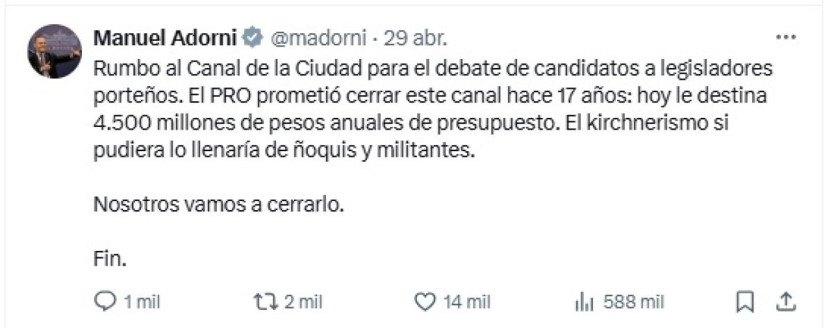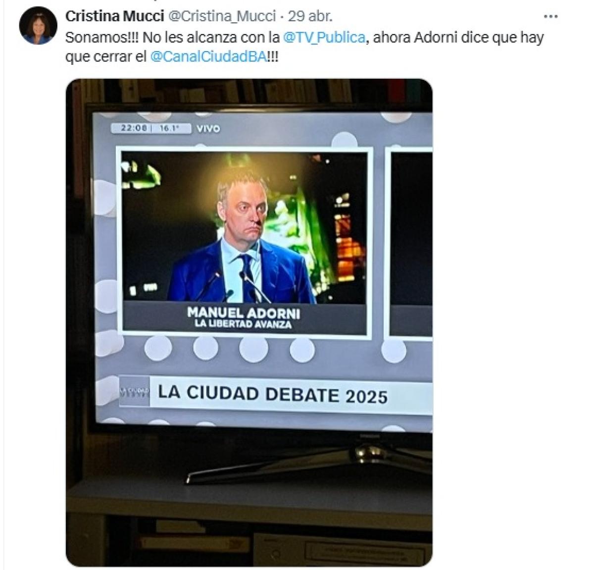 "Sonamos!!! No les alcanza con la @TV_Publica , ahora Adorni dice que hay que cerrar el @CanalCiudadBA !!!" publicó la periodista y crítica literario Cristina Mucci al ver el Debate Capital en el que el funcionario de Milei y actual candidato, Manuel Adorni anunciaba que si ganaban cerraría la señal televisiva de Caba.