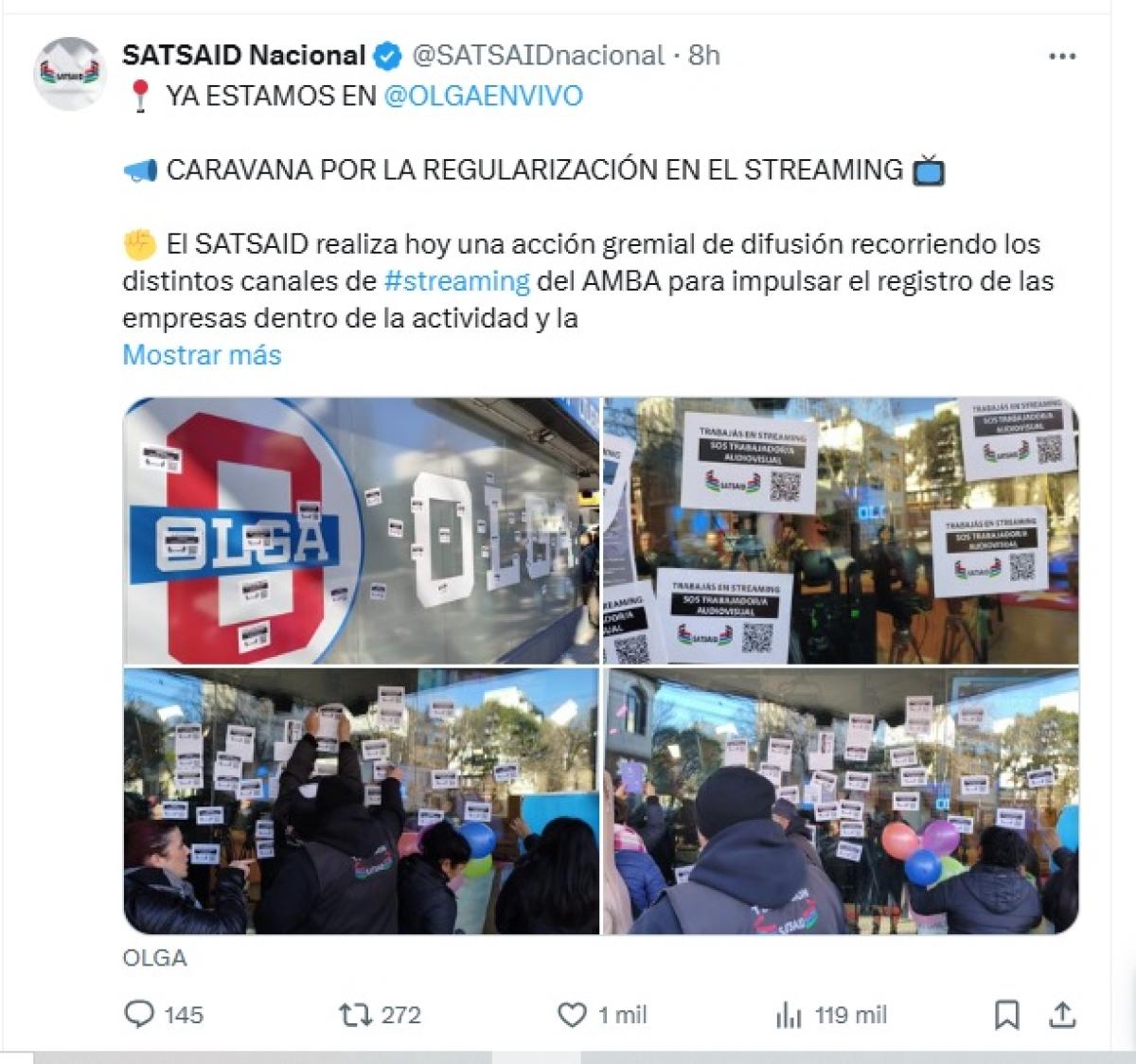 "El SATSAID realiza hoy una acción gremial de difusión recorriendo los distintos canales de #streaming del AMBA para impulsar el registro de las empresas dentro de la actividad y la regularización de sus trabajadores bajo su correspondiente Convenio Colectivo de Trabajo. " fue el posteo del sindicato de Teelevisión luego de las manifestaciones protagonizadas en los Streaming OLGA y Blender.