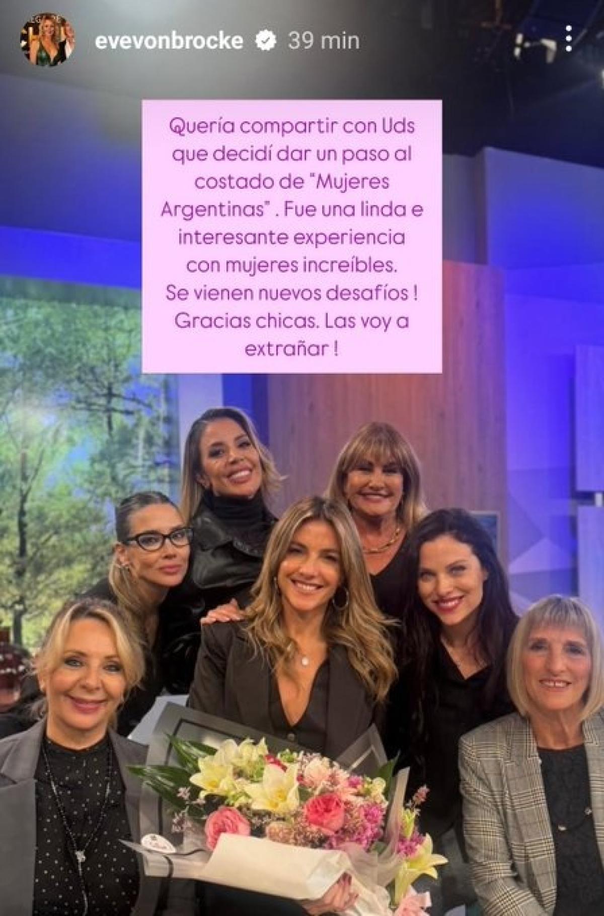"Quería compartir con ustedes que decidí dar un paso al costado de "Mujeres Argentinas". Fueee una linda e interesante experiencia con mujeres increíbles. Se vienen nuevos desafíos! Gracias chicas las voy a extrañar" publicó en su cuenta de Instagram, Evelyn Von Brocke, dando punto final a su experiencia en el programa matutino conducido por María Belén Ludueña.