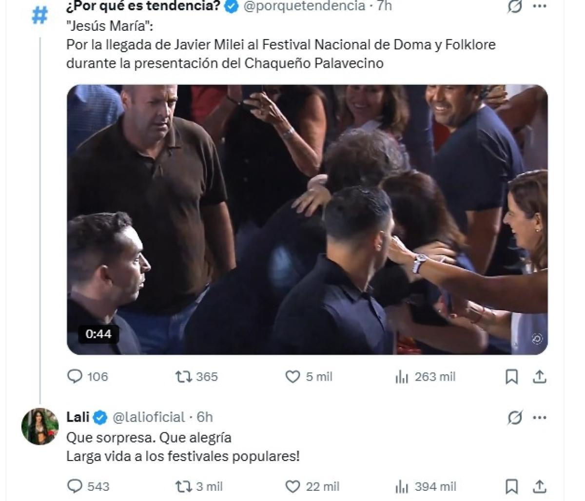 "Que sorpresa... Que alegría... Larga vida a los Festivales Populares" respondió Lali Espósito a la cuenta de "Tendencias Argentina" que mostró la actuación de Milei junto al Chaqueño Palavecino en el Festival de Jesús María (Córdoba) cantando juntos "Amor Salvaje".