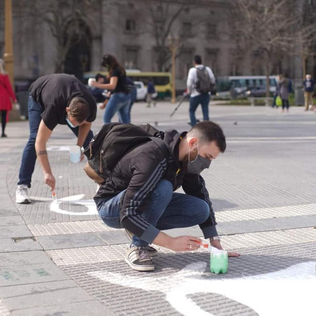 Junto a ellos también estuvo la diputada Victoria Montenegro volviendo a pintar de color blanco la insignia internacional por los Derechos Humanos.
