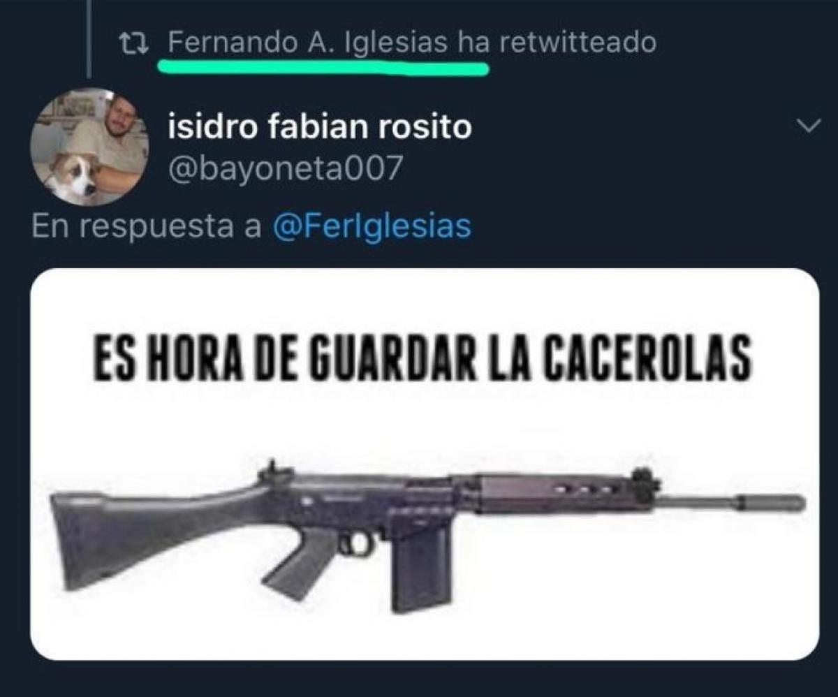El periodista Diego Iglesias le escribió apenas vio el RT: "Me gustaría conocer la opinión de @proargentina o de su presidenta @PatoBullrich o de @juntoscambioar sobre lo siguiente: el diputado Fernando Iglesias, de su espacio político, retuitea a un seguidor que dice “Es hora de guardar las cacerolas” y pone una ametralladora."