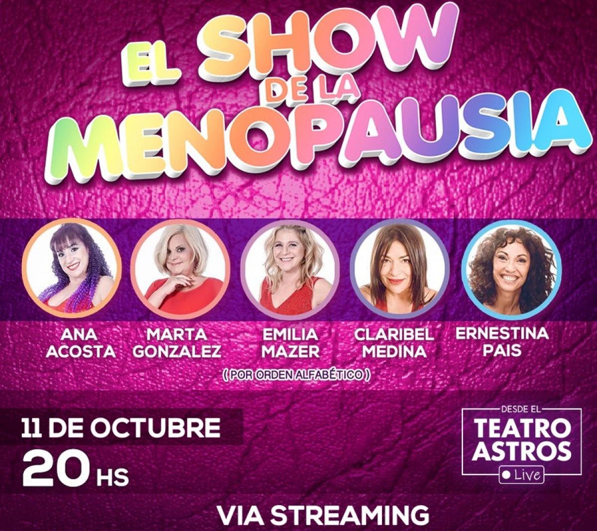 Protagonizada por Ana Acosta, Marta González, Emilia Mazer, Claribel Medina y Ernestina Pais, “El Show de la Menopausia” cuenta la historia de cinco mujeres, que si bien no tienen nada en común entre sí, excepto el reloj biológico que las ha llevado a la década de los cincuenta, descubrirán en el transcurso de sus confesiones, que tienen bastante más en común de lo que nunca hubieran imaginado.