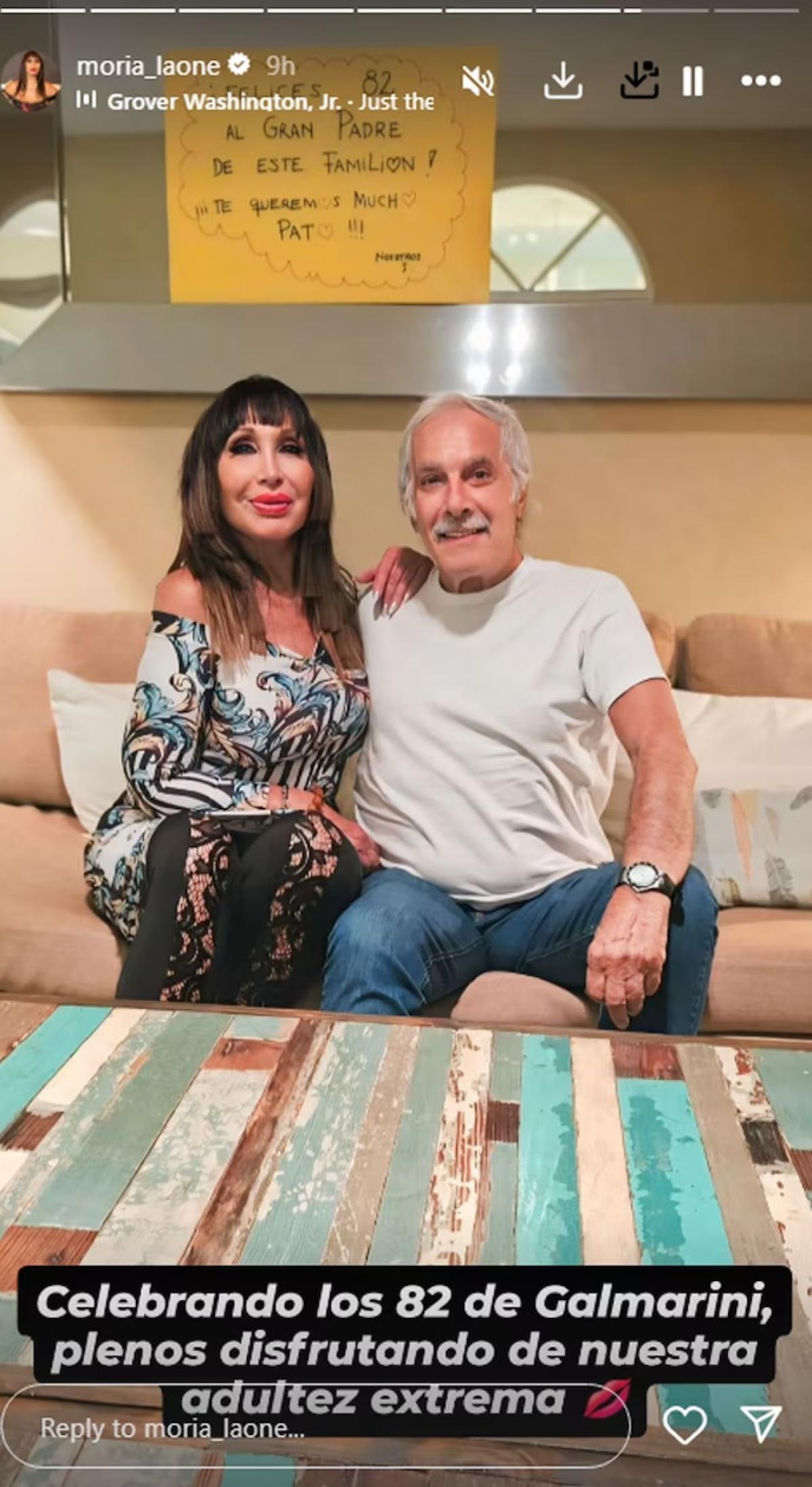 “Celebrando los 82 de Galmarini, plenos disfrutando de nuestra adultez extrema” puso Moria en sus redes sociales. Detrás de la pareja hay un gran espejo en el que se puede ver un cartel que escribió la familia en honor al hombre: “Felices 82 al gran padre de este familión. Te queremos mucho Pat”.