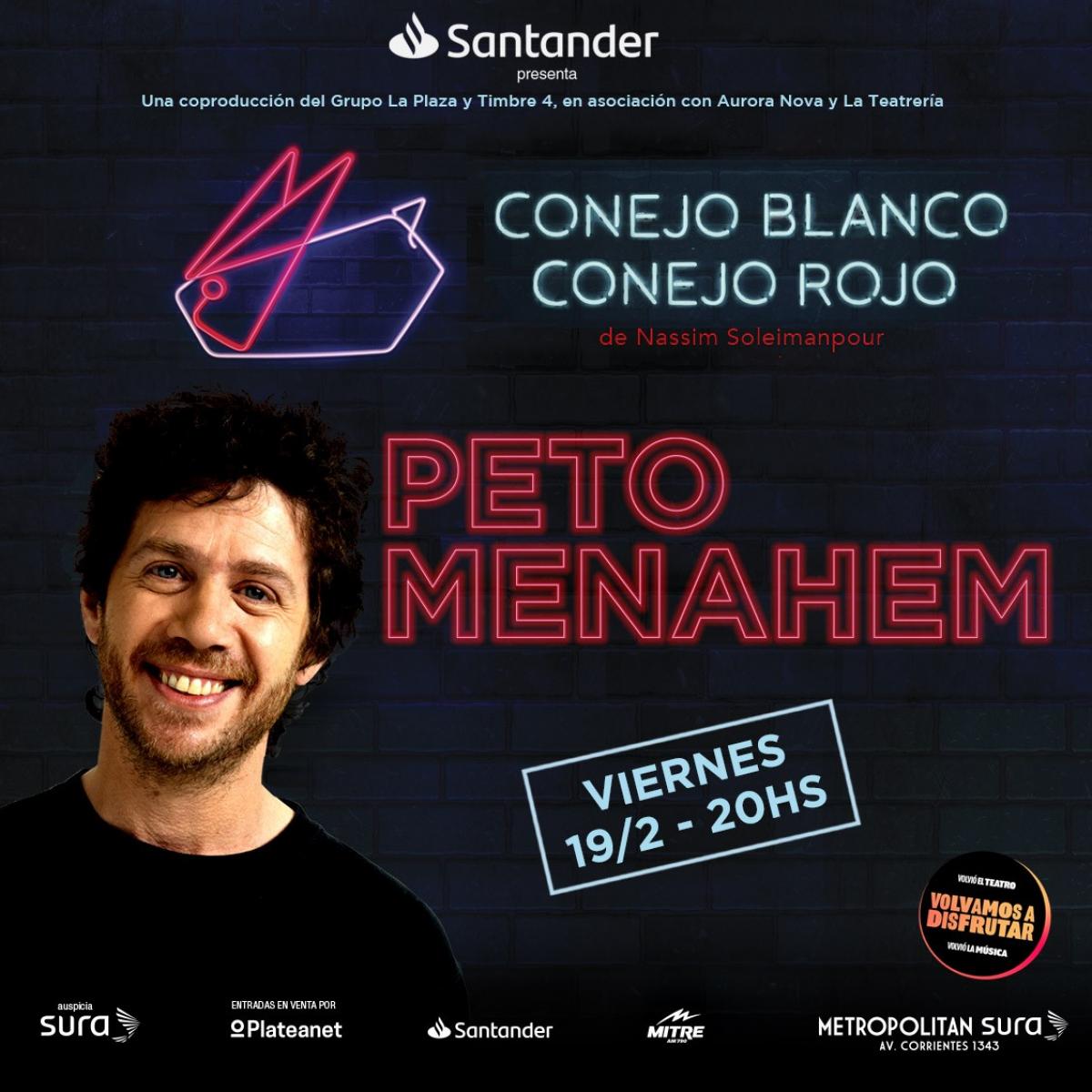 El gran éxito teatral internacional CONEJO BLANCO CONEJO ROJO, del autor iraní Nassim Soleimanpour, arribará al teatro Metropolitan Sura en calle Corrientes a partir del 8 de enero de 2021 gracias a una nueva co producción entre el teatro Metropolitan Sura del Grupo La Plaza (www.metropolitansura.com.ar) y Timbre 4, en asociación con Aurora Nova y La Teatrería.